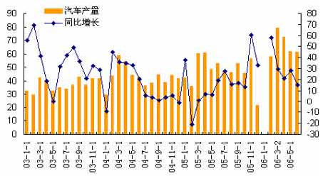 “十五”期间,中国汽车产量以年均10.5%的速度增长,2005年汽车产量615.3 万辆,比增21.35%,其中轿车产量约295.84 万辆。2006年汽车产量728万辆,比2005年增长27.6%,其中轿车387万辆,增长39.7%。