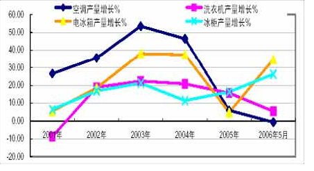 家用空调器经过多年的高速增长,2005 年开始增速明显下降,2006 年延续2005 年增速下降的趋势,2006年上半年空调产量十年来首次呈现负增长。下半年这种趋势不会改变,主要是国内房地产宏观调控,国内1-2 级市场销量下降。洗衣机产量增长情况略好于家用空调,上半年国内洗衣机增速下降到一位数,低增长趋势已经形成。
