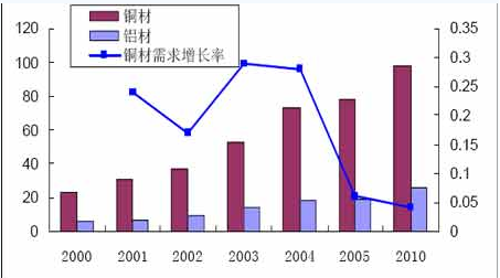 根据预测,“十一五”期间汽车产量保持10%-15%的速度增长。据预测2010 年中国汽车产量将达1000 万辆左右,成为仅次于美国全球的第二大汽车生产国。轿车每辆用铜大约7 千克,大型货车用铜为15 千克。则按加权平均,2010 汽车耗铜量将达11.6 万吨。
