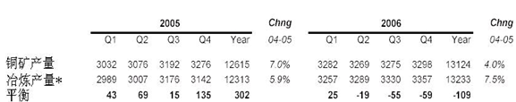 最近几十年里,很少有新的铜矿资源被发现,很少有开矿。所有地区的基本金属的储量都在下降,尽管全球精炼铜供需平衡价格预测都倾向于市场走向平衡,但仍然还有很多未知因素存在,2006年的供需预测是基于对宏观环境正确预测和生产状况保持稳定发展的前提之下的,我们看到,中国政府采取了一系列政策措施来给铜冶炼市场的狂热投资降温,TC/RC初炼/冶炼费用的大幅上涨而同时精炼铜的供应依然紧张,这表明了 行业 的供应瓶颈从矿产环节转移到冶炼环节的状况仍然存在。同时2006年大规模减库后明年消费增幅在一二季度不可避免会高于预期,也就是说如果2006年全年真的如各大机构预测的能够达到平衡,价格的反映也顶多会体现在2006年的后半年中。
