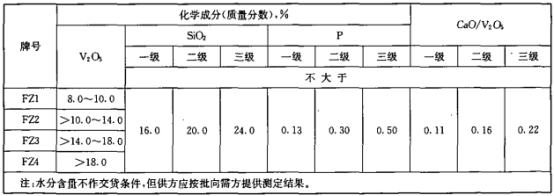 1)钒渣按五氧化二钒的晶位分为4个牌号,其化学成分应符合下表的规定。