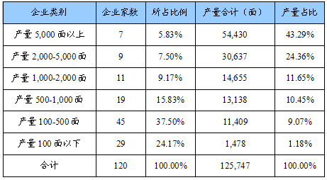 与此同时,该 行业 的企业分化比较明显,规模企业数量较少,2010 年,年产5,000面以上的企业只有7 家,占总生产企业的5.83%,却占有了约43.29%的市场份额;这些规模较大的企业,基本形成了 行业 的主要力量,是主流市场和高端市场的主要供应商。