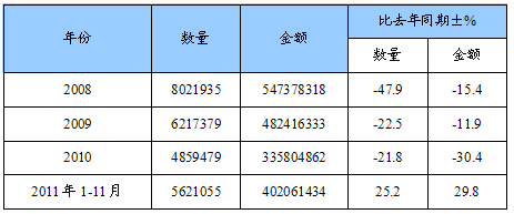 2008-2011年11月其他电气控制或分配盘、板、台等,电压>1000V进口统计