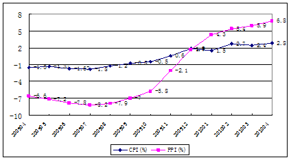 中国为工业主导型经济,经济发展情况主要取决于第二产业的发展情况。2009年全年规模以上工业增加值比上年增长11.0%,增速比上年回落1.9个百分点。其中,一季度增长5.1%,二季度增长9.1%,三季度增长12.4%,四季度增长18.0%。工业增加值增速逐步加快,表明在政府经济刺激计划的带动下工业正稳步好转。从各 行业 表现看,受政府投资强力拉动以及国际市场基础资源价格大幅反弹的影响,黑色金属、非金属、其他矿采选业等资源开发类 行业 处于相对较高水平;而食品、纺织、化学原料制造等轻工业业绩增长则相对平缓。值得关注的是,以水泥、钢铁等为代表的非金属矿物制品业、黑色金属冶炼及压延加工业,产能过剩依然明显,其生产增速的集中大幅提高有可能导致相关产品价格未来面临进一步下行压力。