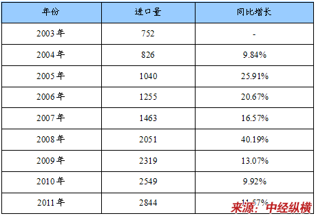 2003-2011年中国牙科拔髓针进口量及同比增长