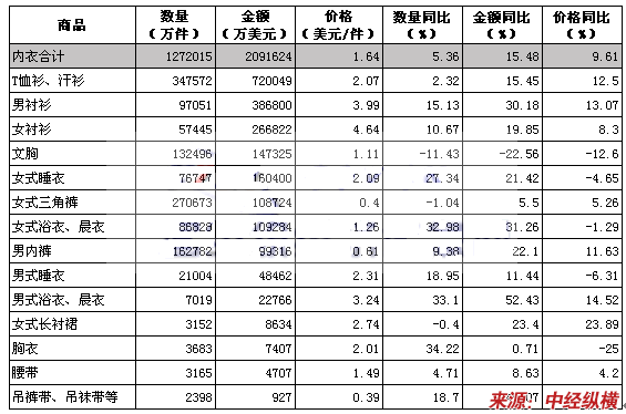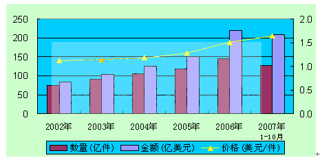 从2007年内衣出口情况看,2007年1~10月共出口内衣达到127.2亿件,创汇209.16亿美元,平均价格为1.64美元/件。比上年同期出口内衣数量、金额和价格增幅分别达到5.36%、15.48%和9.61%。