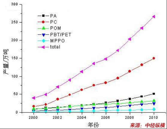 工程塑料与通用塑料相比,机械性能高,耐热性好,附加值高,价格相当于通用树脂的 3~4倍,但市场容量小。世界五大通用热塑性工程塑料只占塑料总产量的2.7%。世界范围内,五大通用工程塑料中需求量最大的是PA,向下依次是PC、POM、PBT/PET和MPPO;我国PC的消费量要大于PA。但近年来由于相关产业的发展和工程塑料优异性能的不可代替性,其已成为发展最快的塑料品种,并有着越来越大的市场份额和应用领域。