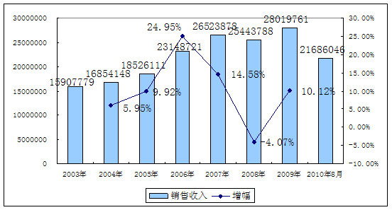 2003-2010年1-8月家用电风扇制造 行业 销售收入发展状况