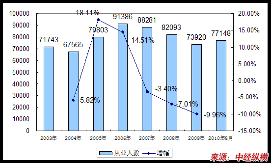 2003-2010年1-8月家用电风扇制造 行业 从业人员发展状况