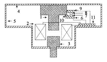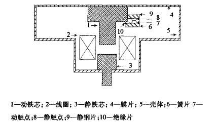 线圈通电产生的磁场经由动铁芯、膜片、壳体、静铁芯、工作气隙闭合,在动静铁芯间的工作气隙处产生电磁吸力。