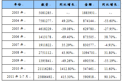 第二节 2003-2011年中国各种天然砂,但第26章的含金属矿砂除外进口统计