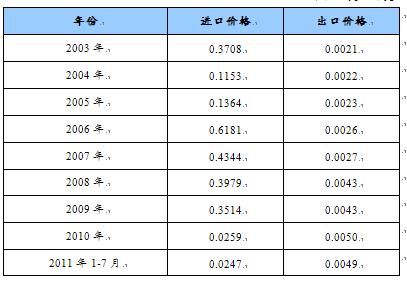 第三节 2003-2011年中国各种天然砂,但第26章的含金属矿砂除外进出口价格对比