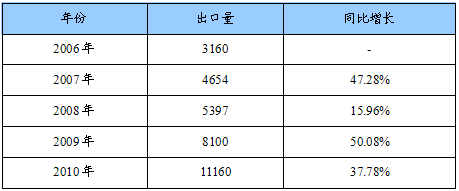 2006-2010年中国氨基葡萄糖原药出口量及同比增长