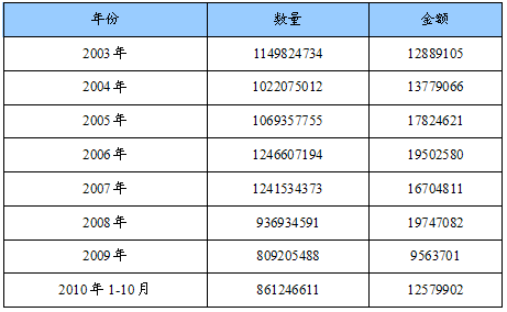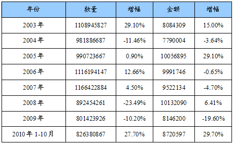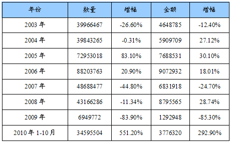 2003-2010年白云石总出口量值统计