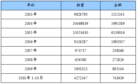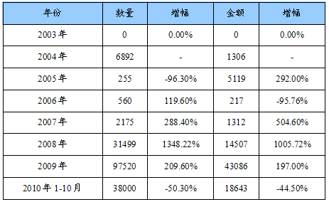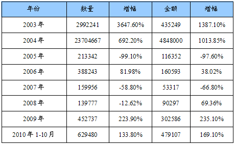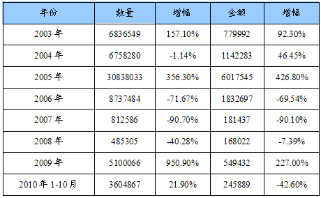 2003-2010年白云石总进口量值统计