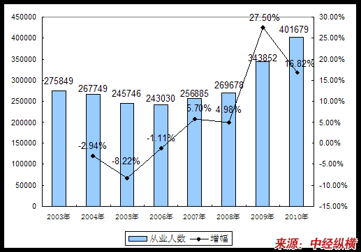 2003-2010年粘土砖瓦及建筑砌块制造 行业 从业人员发展状况