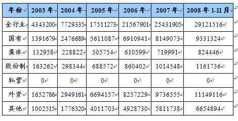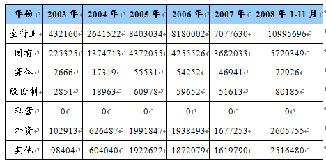 2003-2008年1-11月钨钼矿采选业不同所有制企业利润总额 单位:千元