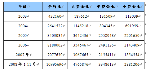 2003-2008年1-11月钨钼矿采选业不同规模企业利润总额 单位:千元