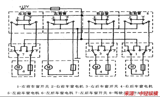 可见,电动车窗控制电路中,一般都设有驾驶员集中控制的主控开关和每一个车窗的独立操作开关,每个车窗的操作开关可由乘客自己操作。但是,有些汽车的主控开关备有安全开关,可以切断其他各车窗的电源,使每个车窗的操作开关不起作用,这个开关只能由驾驶员一人操作。