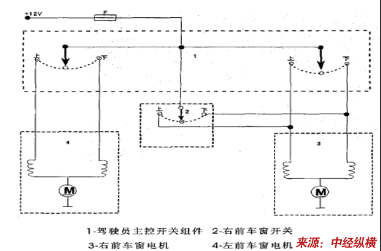 电动机不搭铁的控制方式,因为窗户开关既控制电动机的电源线,又控制电动机的搭铁线,所以开关的结构和线路比较复杂,但由于电动机结构简单,所以应用比较广泛。