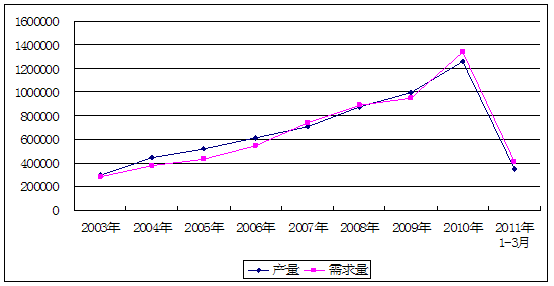 我国电力整流器件近几年产销均保持了高速增长,市场需求量大,基本供不应求,2011年1-3月,电力整流器件累计产量达347757万只,比上年同期增长10.93%;需求量达413242万只,比上年同期增长23.63%。从区域分布看,生产主要集中在华北地区,占总产量的比重超过50%,需求主要分布在华东、华南和华北地区,西南、西北市场也具很大潜力。