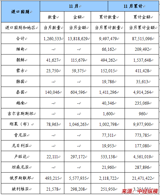 2008年11月中国钨矿砂及其精矿分国别进口量 计量单位:千克;金额单位:美元