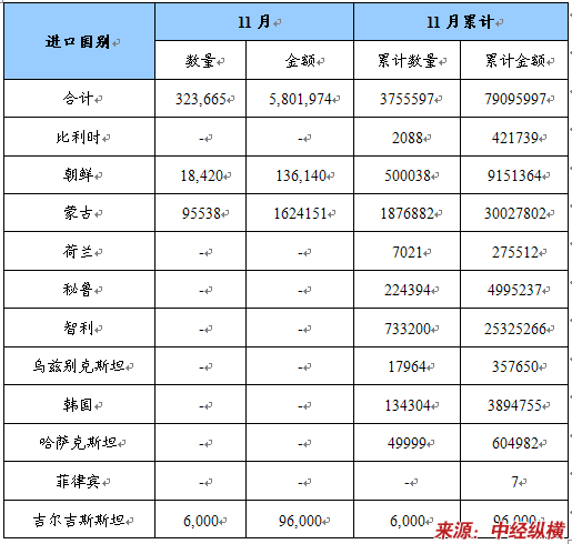 2008年11月中国钼矿砂及其精矿分国别进口量 单位:千克、美元