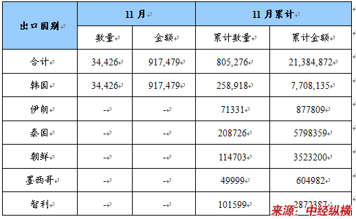 2008年11月中国钼矿砂及其精矿分国别出口量 单位:千克、美元