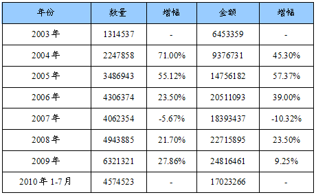 2003-2010年85123011 机动车辆用喇叭、蜂鸣器进口量值统计