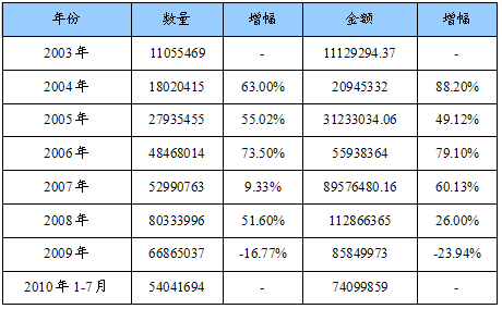 2003-2010年85123011 机动车辆用喇叭、蜂鸣器出口量值统计