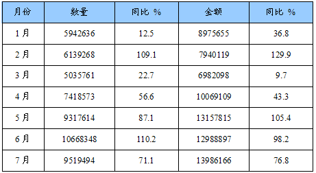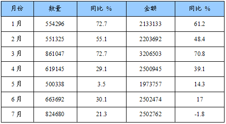 2010年1-7月分月85123011 机动车辆用喇叭、蜂鸣器进口量值统计