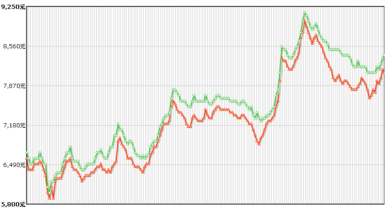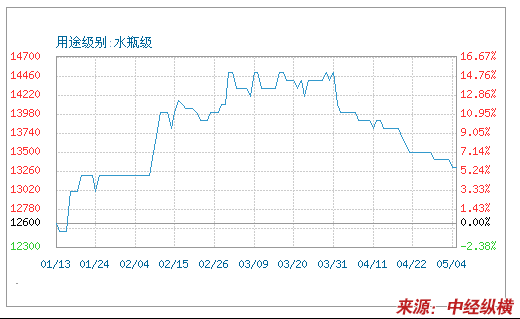 2011年4月国内PET华东市场行情阶梯形下滑。水瓶级PET月初主流报价集中在14000元/吨左右,月末主流报价回落至13400元/吨左右,跌幅在4.29%。出口实际商谈价格在1670-1700美元/吨附近(FOB中国主港),市场交易气氛平淡,实际商谈不多。