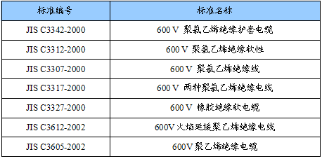 国际市场上,电线电缆国际性标准主要是IEC国际电工委员会标准,简称IEC标准,但IEC标准缺少在日本已普及的线种和规格,例如:缺少600V PVC绝缘电线中的(VVF)平形电缆、缺少户外用PVC绝缘电线(OW)、引人线PVC绝缘电线(DC)。在VVF中,缺少已普遍使用的规格如1.6mm2、2.0mm2、2.6 mm2等,以及超过35 mm2的大规格电线。