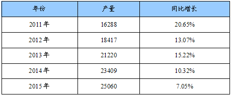 2011-2015年中国氨基葡萄糖原料药产量及同比增长预测