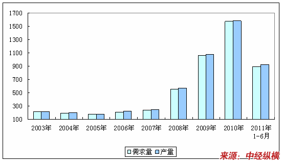 2003-2011年上半年中国钢筋混凝土轨枕产量、需求量对比