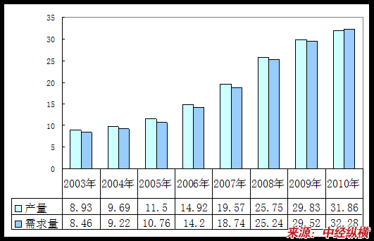 2003-2010年中国高锰钢铸造件产量、需求量对比图
