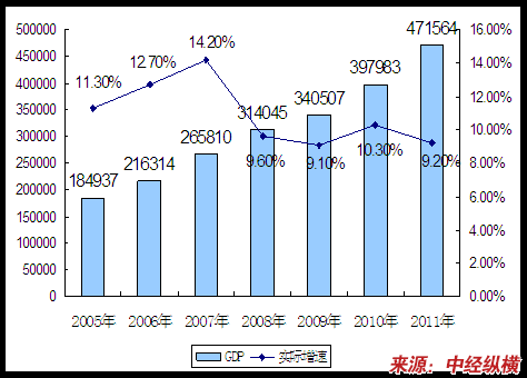 根据中国政府制定的「十二五 规划 」,于二零一一年至二零一五年,预期中国的国内生产总值录得7%至7.5%的复合年均增长率。下图载列于二零零五年至二零一一年中国的国内生产总值及每年实际国内生产总值增长率。