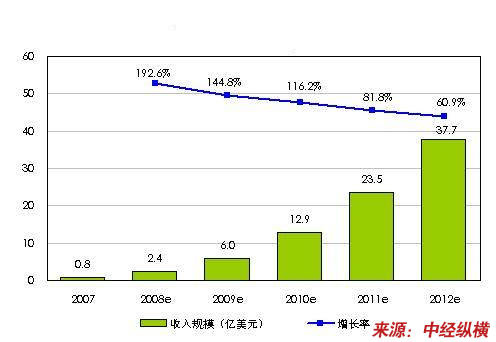 相关数据显示,2007年全球手机付费搜索广告市场收入规模为0.8亿美元,2008年有望达到2.4亿美元,比2007年增长192.6%,预计到2012年全球手机付费搜索广告市场的收入规模将达到37.7亿美元。