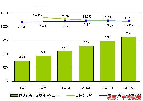 预计,仅就不包含搜索引擎在内的狭义网络广告市场而言,也将于2008年底突破100亿元大关,达到121.7亿元人民币。
