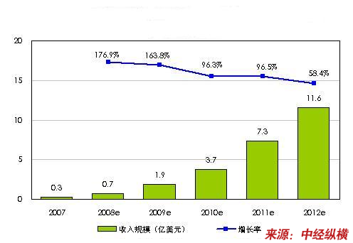 2007年亚太地区手机付费搜索广告市场的收入规模为0.3亿美元,预计到2008年将达到0.7亿美元,比2007年增长176.9%,到2012年亚太地区手机付费搜索广告市场的收入规模将达到11.6亿美元。