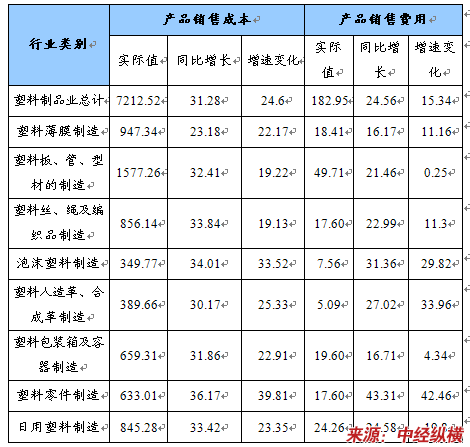 塑料制品业产品销售费用182.95亿元,同比增长24.6%,增速比去年同期加快15.3个百分点。产品销售费用增长最快的是塑料零件制造业,累计销售费用17.6亿元,同比增长43.3%,超过 行业 平均增速9个百分点。
