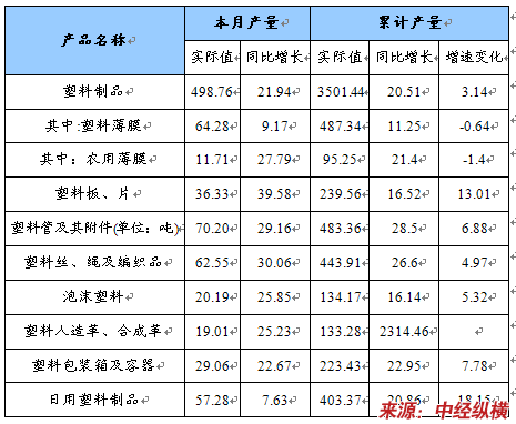 塑料制品业产量当月同比增加21.9%,累计增加20.5%。当月各产品产量同比均呈增长态势,其中塑料板、片、塑料丝、绳及编织品产量增幅较大,增速超过30%。