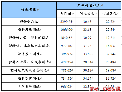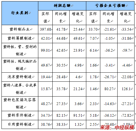 塑料制品业利润总额397.68亿元,同比增长41.8%。从各子 行业 的情况来看,塑料零件制品业实现利润增速最快,同比增速82.2%,其次是塑料薄膜制造业,利润同比增长44.7%,另外,塑料板、管、型材制造业实现利润增速也超过40%