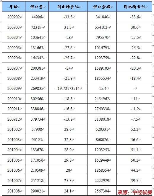 1-8月,塑料制品累计进口同比增长24.1%,而去年同期为下降21.8%;进口额同比增长38.2%。进口额的增长速度快于进口量增速,说明塑料制品的进口价格上升较快。
