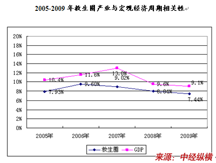 从图中可以看出,救生圈 行业 产量增幅与国家宏观经济环境存在着一定的相关性,除了2007年以外,最近几年的产量增速和GDP基本同步。