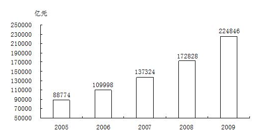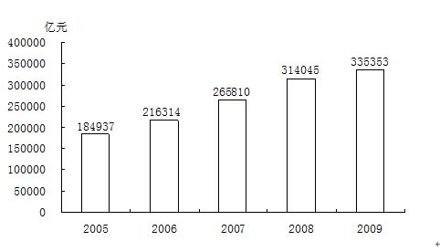 初步核算,2009年全年国内生产总值335353亿元,比上年增长8.7%。分产业看,第一产业增加值35477亿元,增长4.2%;第二产业增加值156958亿元,增长9.5%;第三产业增加值142918亿元,增长8.9%。第一产业增加值占国内生产总值的比重为10.6%,比上年下降0.1个百分点;第二产业增加值比重为46.8%,下降0.7个百分点;第三产业增加值比重为42.6%,上升0.8个百分点。