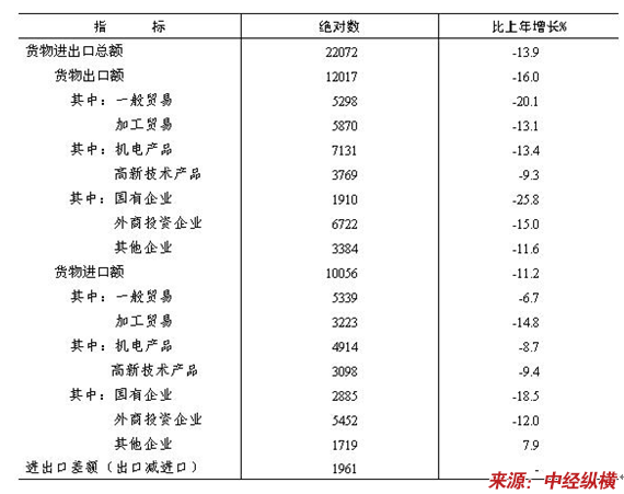 全年货物进出口总额22072亿美元,比上年下降13.9%。其中,货物出口12017亿美元,下降16.0%;货物进口10056亿美元,下降11.2%。进出口差额(出口减进口)1961亿美元,比上年减少1020亿美元。