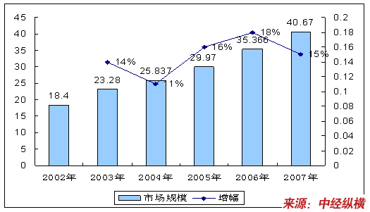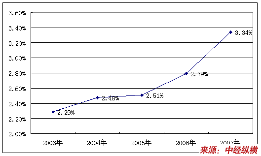 2003-2007年我国频谱仪国内市场容量占全球世界容量的比例变化图