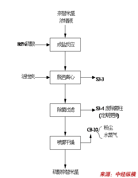 硫酸奈替米星生产工艺流程及“三废”排放点位图见图。