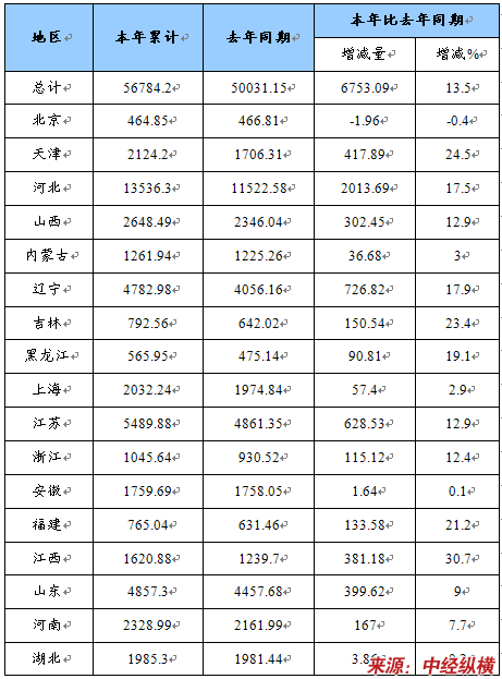 4、市场销售增长平稳较快,部分产品销售快速增长。全年社会消费品零售总额125343亿元,比上年增长15.5%;扣除价格因素,实际增长16.9%,实际增速比上年同期加快2.1个百分点。其中,城市消费品零售额85133亿元,增长15.5%;县及县以下消费品零售额40210亿元,增长15.7%。分 行业 看,批发和零售业消费品零售额105413亿元,增长15.6%;住宿和餐饮业消费品零售额17998亿元,增长16.8%。在限额以上批发和零售贸易业商品零售中,除通讯器材类外,其他20类商品零售均实现较大幅度增长。其中,服装、鞋帽、针纺织品类增长18.8%,家具类增长35.5%,汽车类增长32.3%。